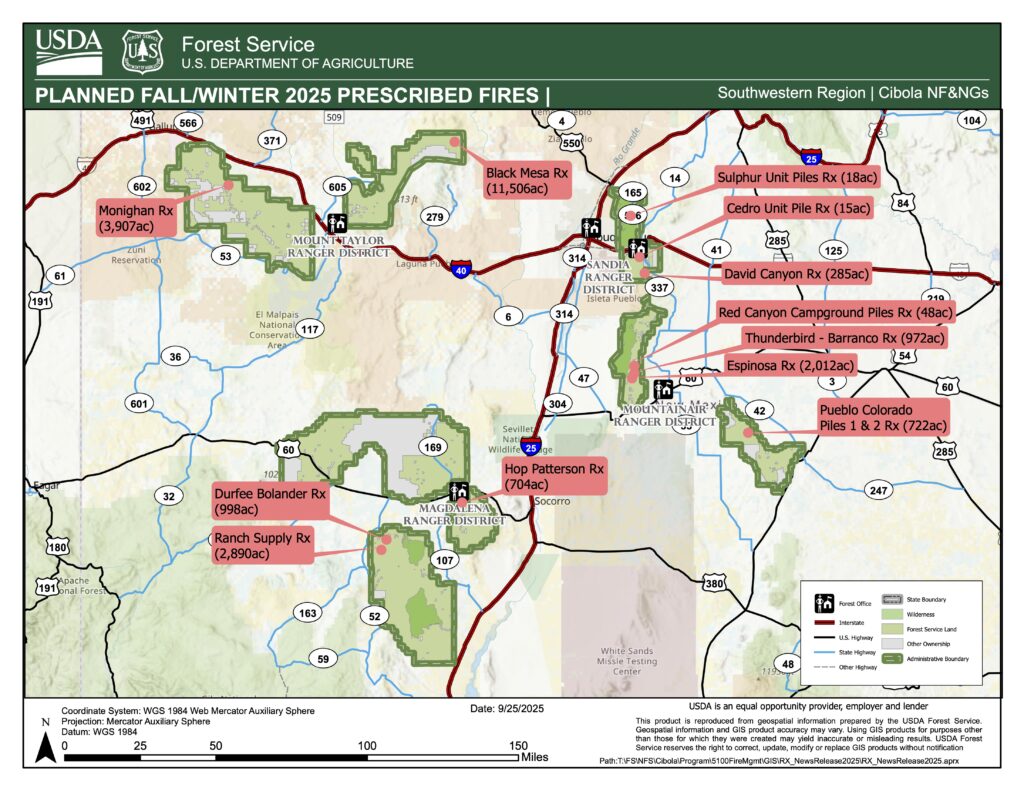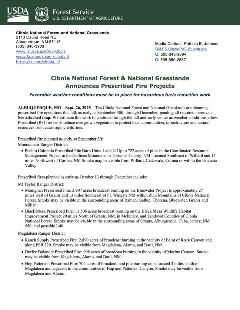 ALBUQUERQUE, NM – Sept. 26, 2025 – The Cibola National Forest and National Grasslands are planning prescribed fire operations this fall, as early as September 30th through December, pending all required approvals. See attached map.