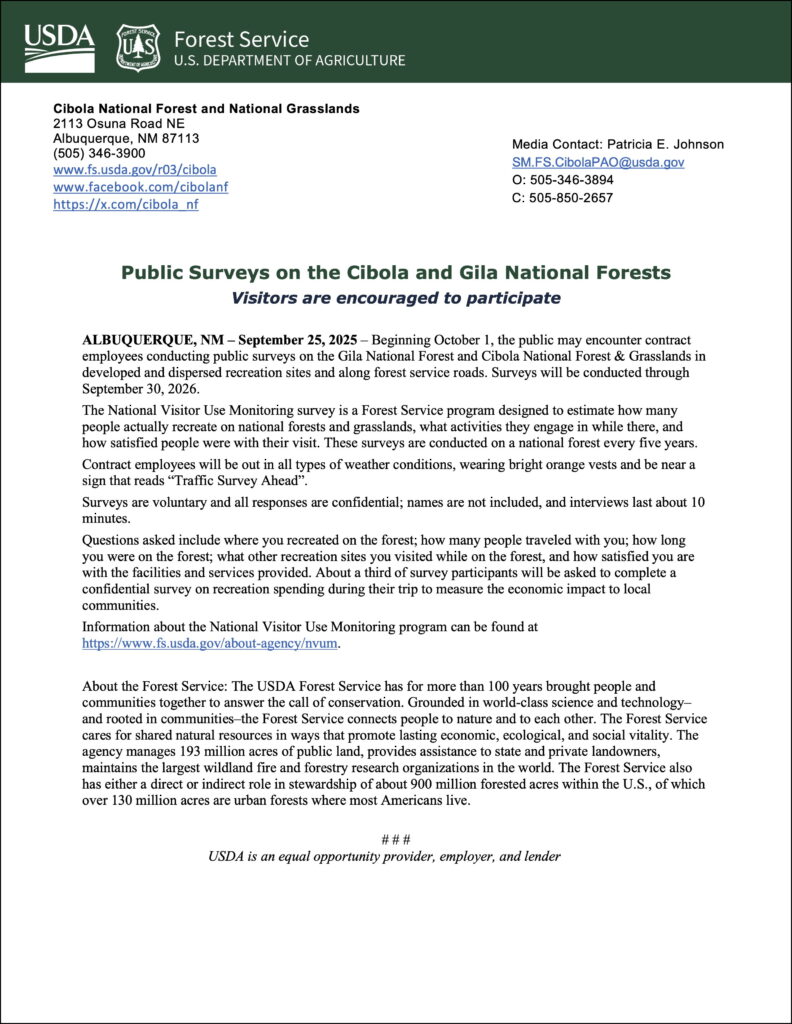 ALBUQUERQUE, NM – September 25, 2025 – Beginning October 1, the public may encounter contract employees conducting public surveys on the Gila National Forest and Cibola National Forest & Grasslands in developed and dispersed recreation sites and along forest service roads. Surveys will be conducted through September 30, 2026.