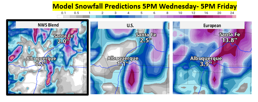 It’s the second system for Thursday evening/night into Friday, which will be much colder, that shows the most promise for widespread significant snowfall. Just today, forecast models have come into very good agreement on tracking the upper-level low from west-central NM to just south of Socorro to east-central NM Thursday night into Friday morning. This is a favorable storm track for snow in the East Mountains, but we don’t want it shifting much farther south. Heavy snow favors areas to the north and northeast of the upper-level storm track. It will most certainly feel and look like winter on Friday!
