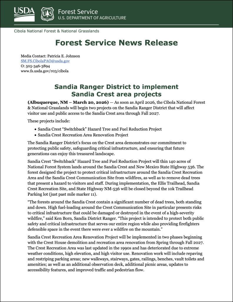 March 20, 2026 – As soon as April 2026, the Cibola National Forest will begin two projects that will affect visitor use and public access to the Sandia Crest area through fall of 2027.