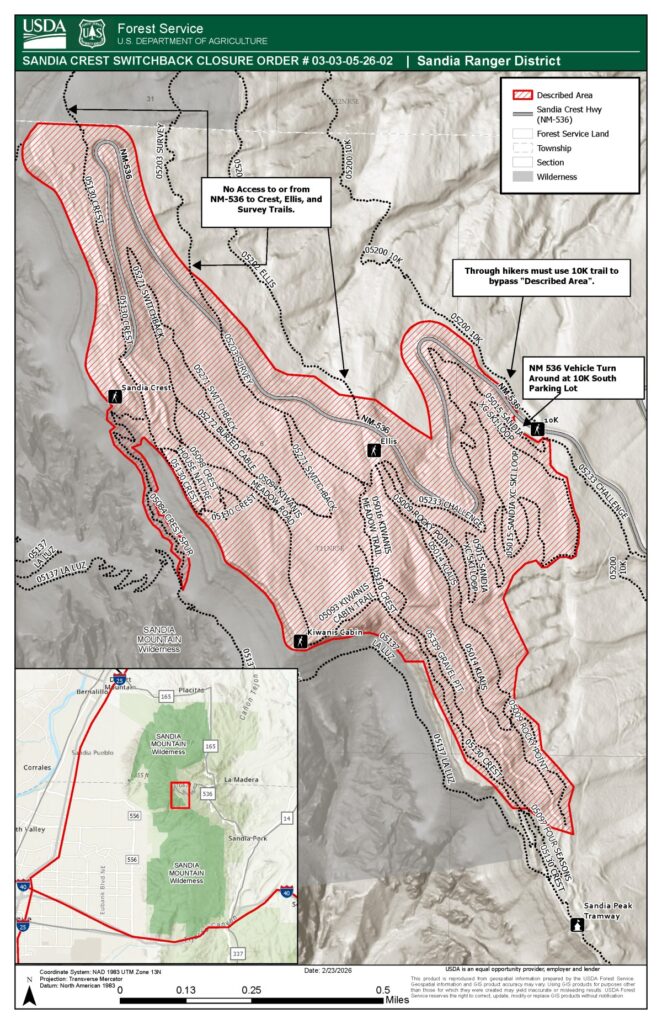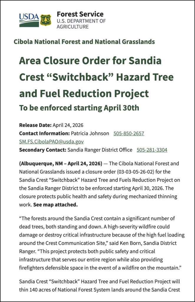 April 23, 2026 – Canyon Young, Sandia Ranger District Trails & Wilderness Program Manager, reported that the Crest Highway closure will begin on April 30.
