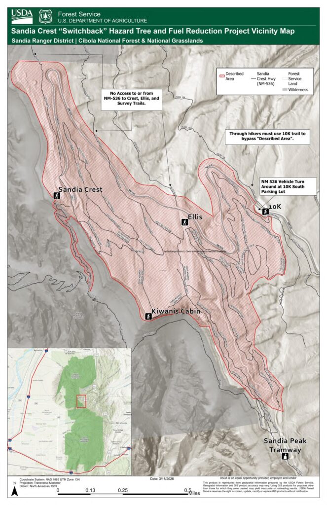 During the implementation of these projects, the Sandia Crest Recreation Area and nearby trails and recreation sites will be closed to the public for an extended period.