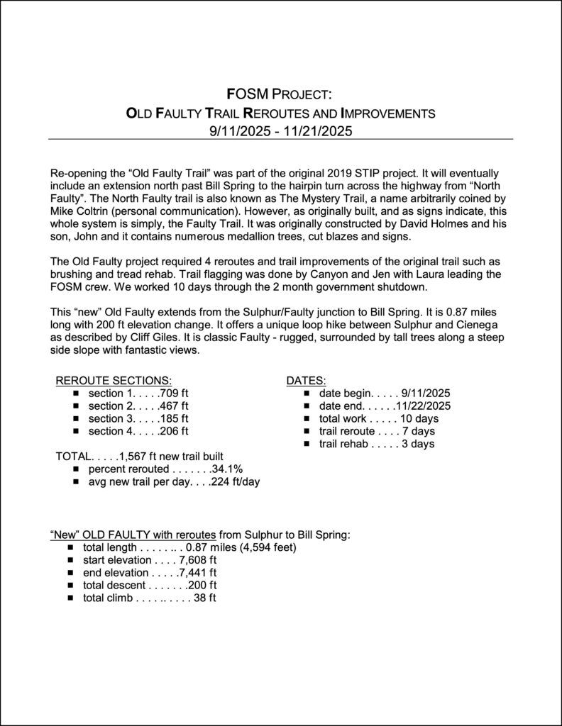 November 21, 2025 – Thirteen FOSM volunteers along with with Sandia Ranger District Trails Foreman Jen Medina-Gray finished work on Old Faulty Trail improvements. Volunteer Luis Caudros published a comprehensive summary of the project accomplished over 10 working days that spanned the longest government shutdown in history.