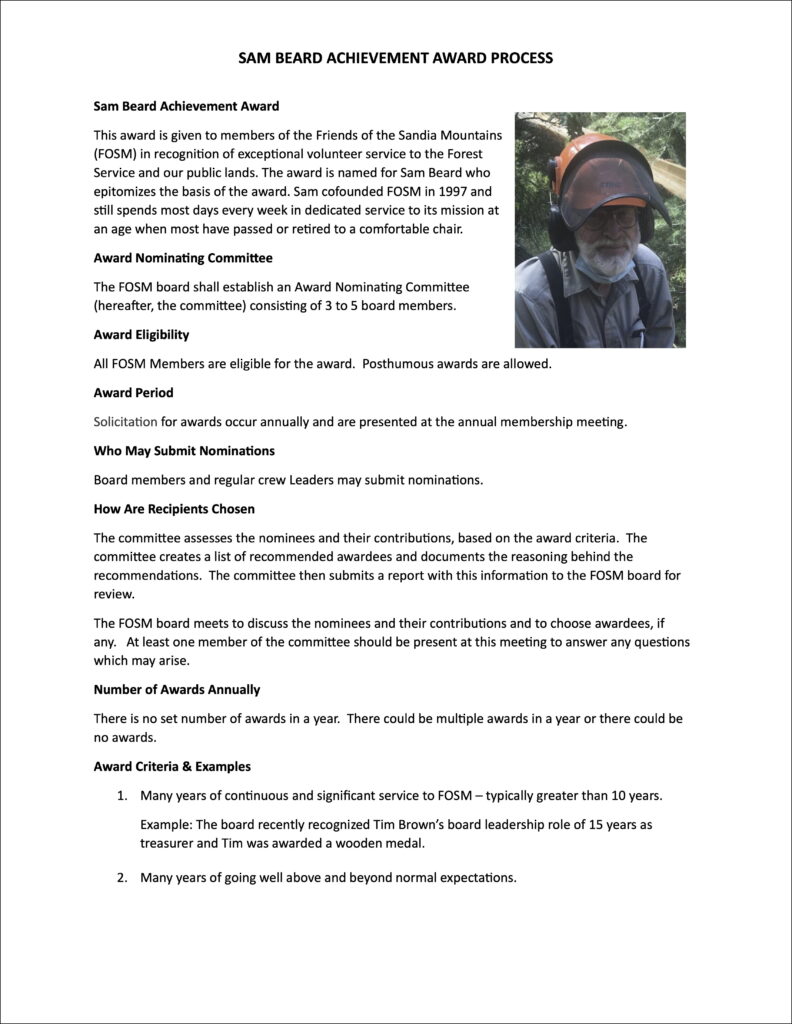Friends of the Sandia Mountains began bestowing it’s own award for outstanding volunteer service in 2024. The award is named for Sam Beard who epitomizes its basis. Sam cofounded FOSM in 1997 and still spends most days every week in dedicated service to its mission at an age when most have passed or retired to a comfortable chair.