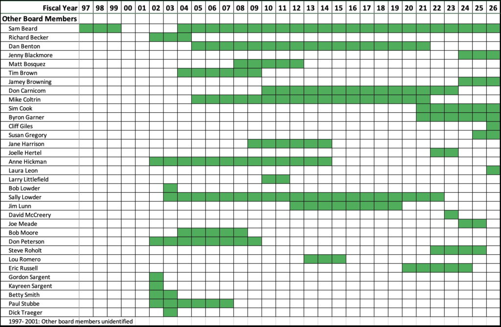 The chart below shows previous members of the FOSM board not serving as officers. The makeup of the board from 1997 through 2006 is uncertain. Fortunately, annual newsletters beginning in 2007 identify officers and board members since then. Obtaining bios and photos of past officers proved daunting enough that trying to find information about other board members who did not serve as an officer seemed a bridge too far.