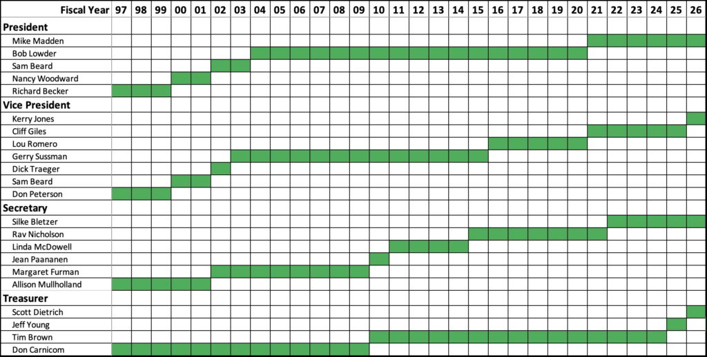 The chart below lists the volunteers who have held the four FOSM offices since the founding of the corporation in 1997. Terms before 2007 are best guesses based on collective memories. Short bios and photos are included as available.