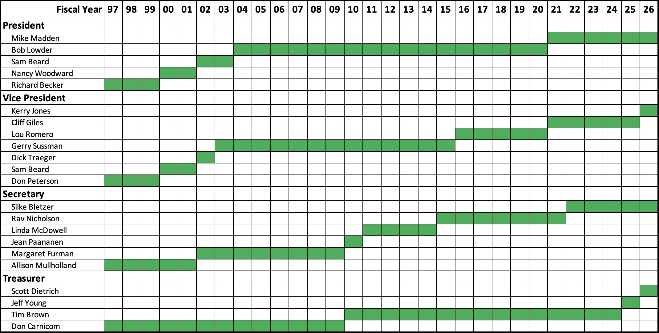 The chart below lists the volunteers who have held the four FOSM offices since the founding of the corporation in 1997. Terms before 2007 are best guesses based on collective memories. Short bios and photos are included as available.