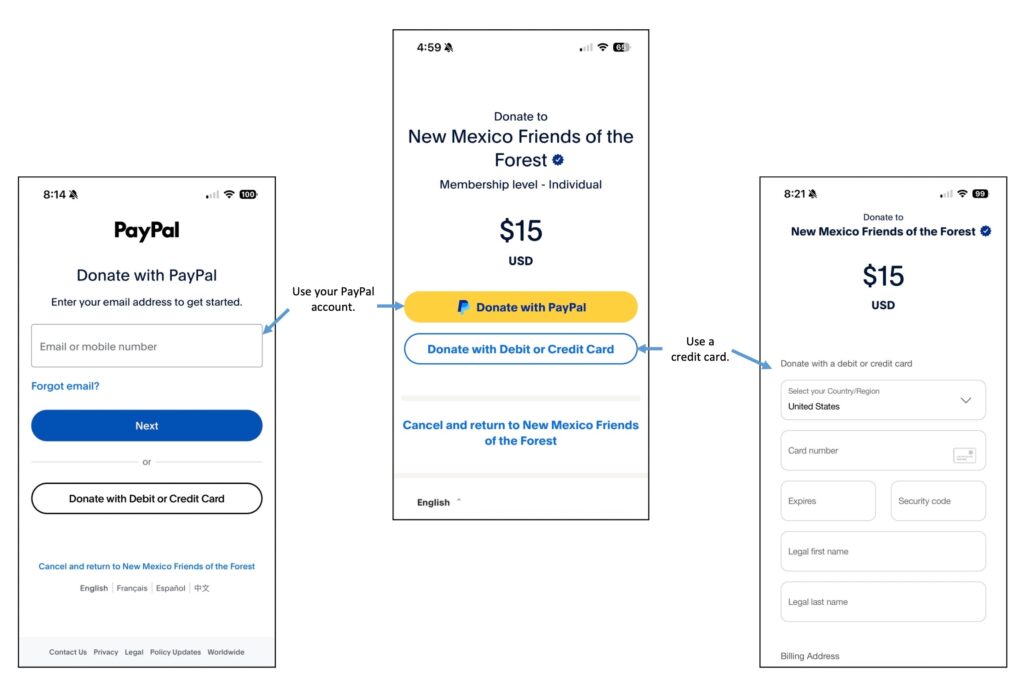 You will receive confirmation notices from both PayPal and FOSM after the transaction is complete. Our organization incorporated in 1997 as New Mexico Friends of the Forest then later began using Friends of the Sandia Mountains (FOSM). PayPal requires use of our legal name, so your receipt will include a statement similar to this: