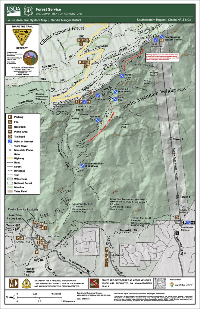 The most recent USFS Trail Map for La Luz can be found by clicking on the small-format image. The map can be downloaded and is compatible with the Avenza Maps smart-phone app.