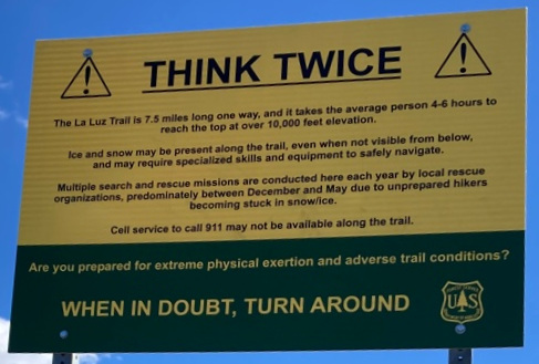 There have been more than 82 La Luz area search and rescue incidents in the last dozen years. Many hikers have been injured, and several people have died. During snowy years, there have been as many as 16 search and rescue incidents in one year.