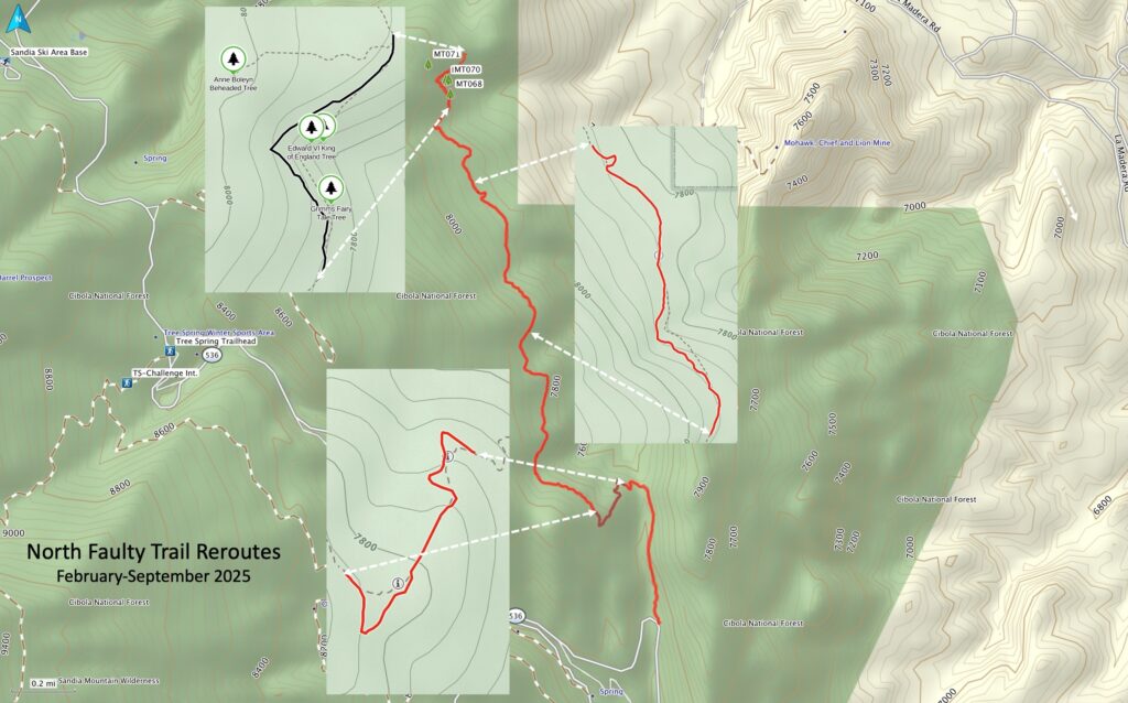 September 5, 2025 – FOSM crew leader Laura Leon announced completion of a project to improve the south end of what has now been officially designated as North Faulty Trail (No. 197). The project started way back in February. Laura reported, “… 19 different FOSM volunteers spent time working on these reroutes, with about 10 volunteers per week which comes out to about 1300 hours of grinding work.” The effort, spread over 21 Thursday work sessions, was done with and under the leadership of Sandia Ranger District (SRD) personnel Canyon Young, Jen Medina-Gray, and Chris Secor. A huge Thank You and Congratulations to everyone who contributed!