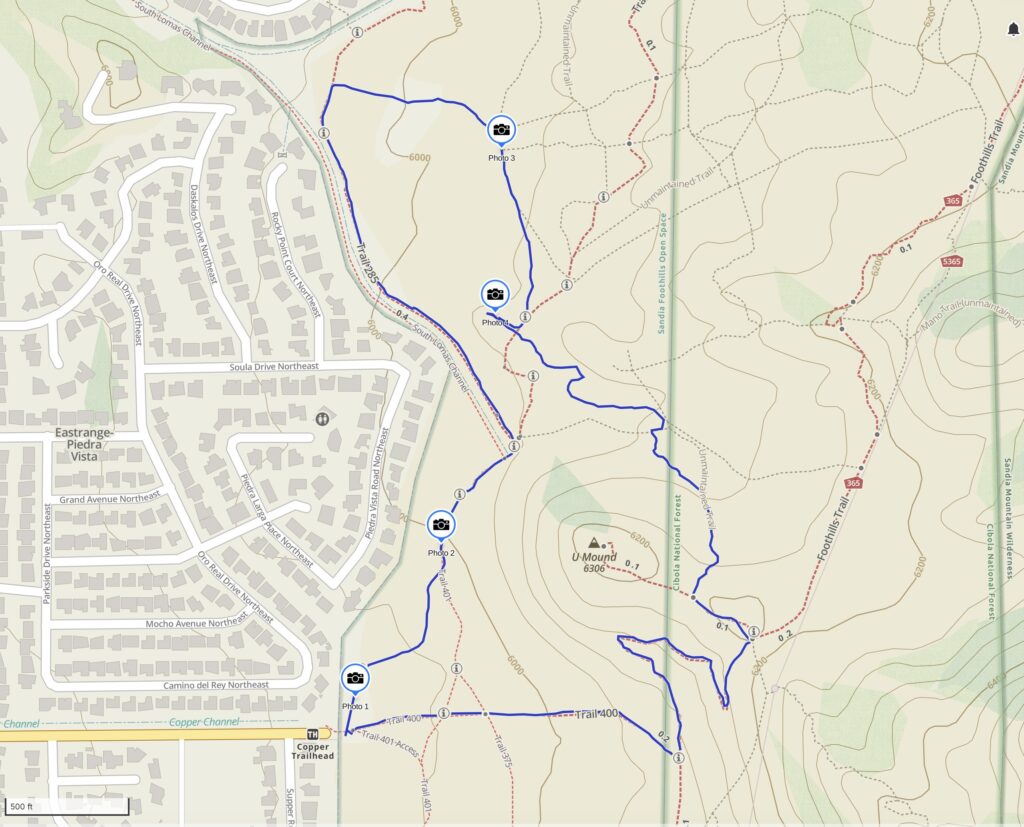 - Coyotes – 8 students with faculty member Chelsea Christopher and driver Nina Denisova accompanied by FOSM volunteers Mike Madden and Sim Cook traversing trails starting at Embudo Trailhead and ending at Copper Trailhead.