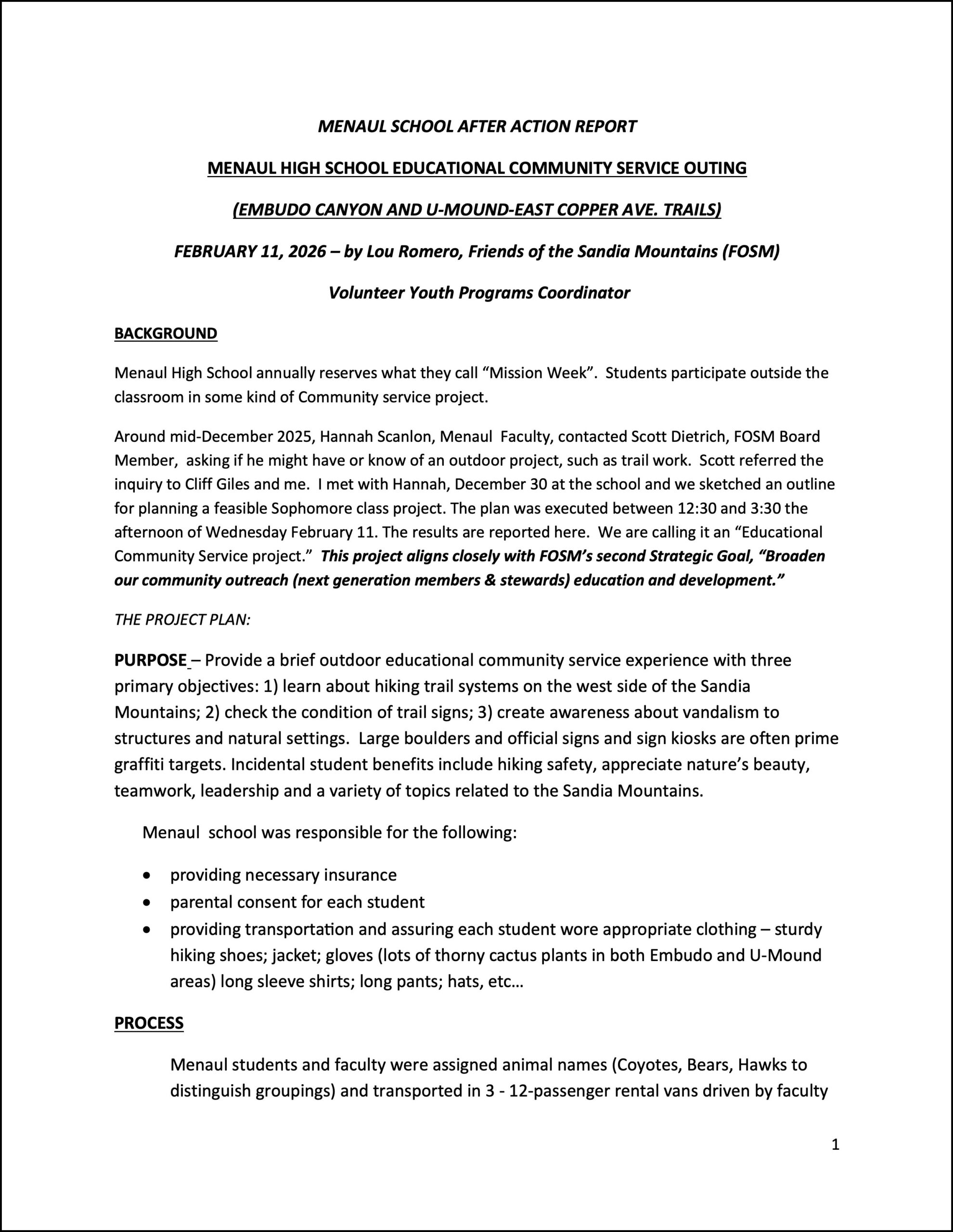 February 11, 2026 – FOSM partnered with Menaul School to clean up trash and locate graffiti in the Foothills trail system south of the Embudo Trailhead as a part of the school’s annual “Mission Week” during which students participate outside the classroom in a community service project. The activity was organized by Lou Romero, FOSM Volunteer Youth Programs Coordinator, and Hannah Scanlon of the Menaul faculty. Lou’s detailed after-action report can be found at right.