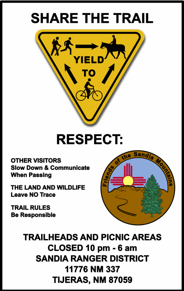 Sandia Crest – This ¾ mile loop trail begins south of the Crest House. It offers spectacular views of the Rio Grande valley and takes visitors into the sub-alpine forest. Most of the illustrated signs are identical to the Sandia Peak trail mentioned above.