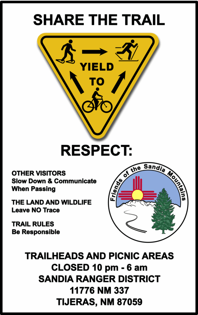 The best way to monitor trail conditions and contribute to their maintenance is to become a member of Cibola Trail Rangers. A webpage provides recent reports of general conditions or specific hazards or obstacles gleaned from reports by CTR members or other hikers. A separate page provides information specific to La Luz Trail conditions. Further information and pictures can be found on the Sandia Snowshoe Classic and Winter Scenes pages during winter.