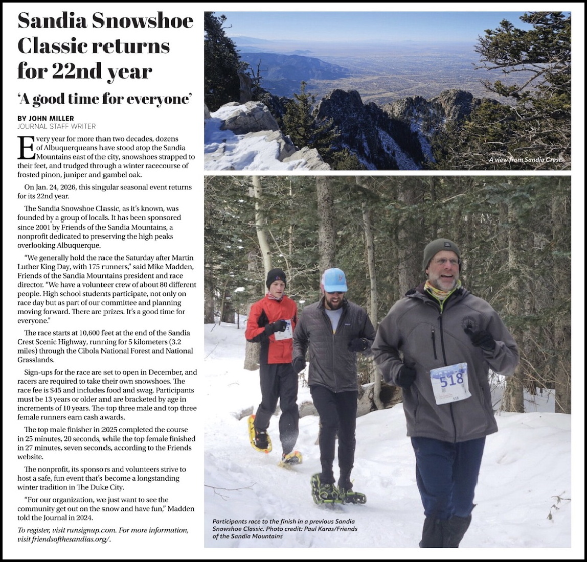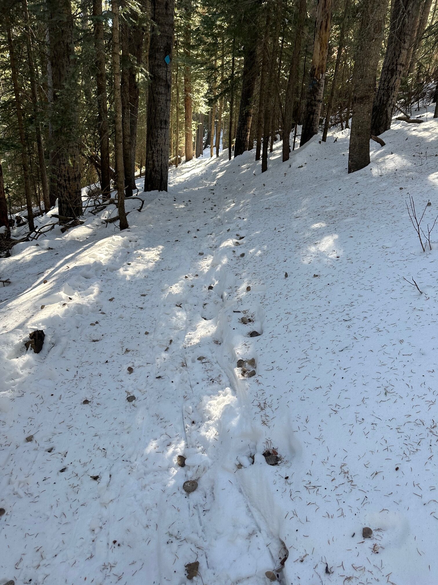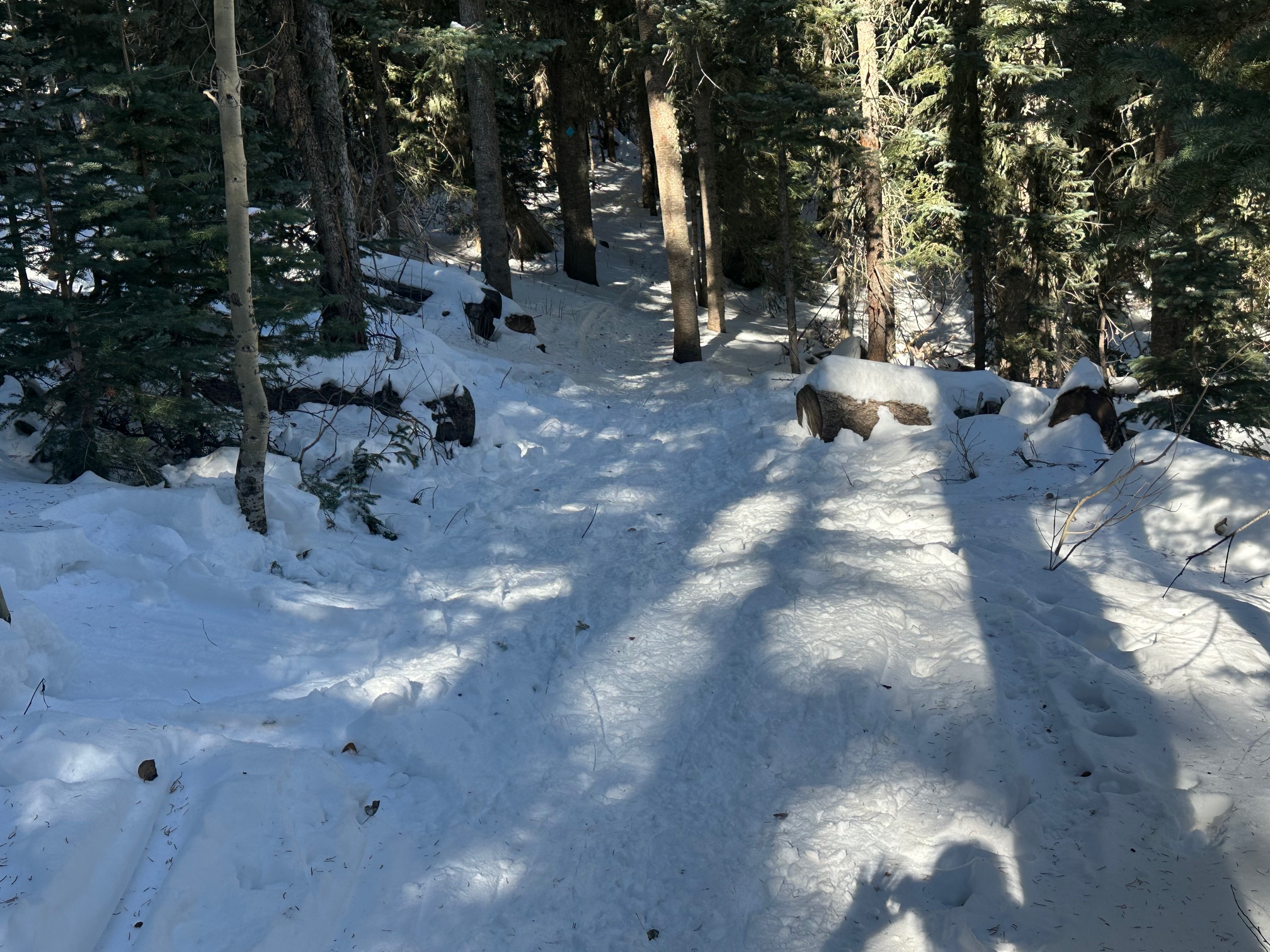 December 10, 2025 – Steve Roholt reported: I spent some time shoveling snow and packing with snowshoes with the goal to level out the Upper Switchback Trail. I’m in the process of discussing this issue with Sam. This trail is adopted by the New Mexico Cross Country Ski club and is used for the snowshoe classic. It’s a non-wilderness, multiuser, all-season, official FS trail.