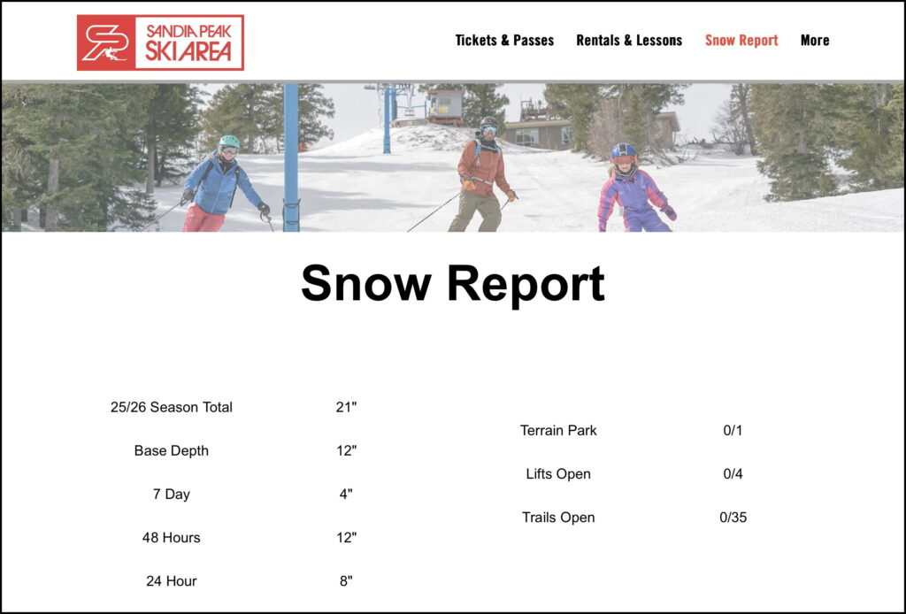 January 9, 2026 – Great news! Sandia Peak Ski Area reports 12 inches of snow in the past 48 hours and will be opening tomorrow. The snowshoe course is covered in fresh powder awaiting cross-country skis and snowshoes.