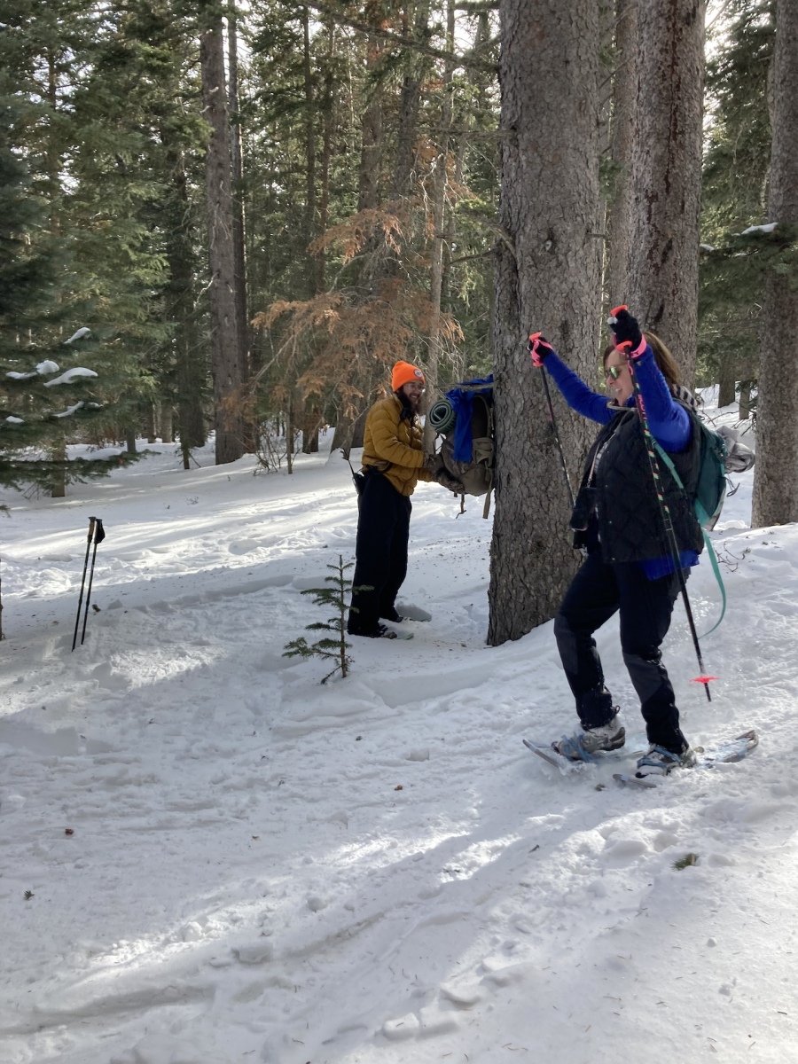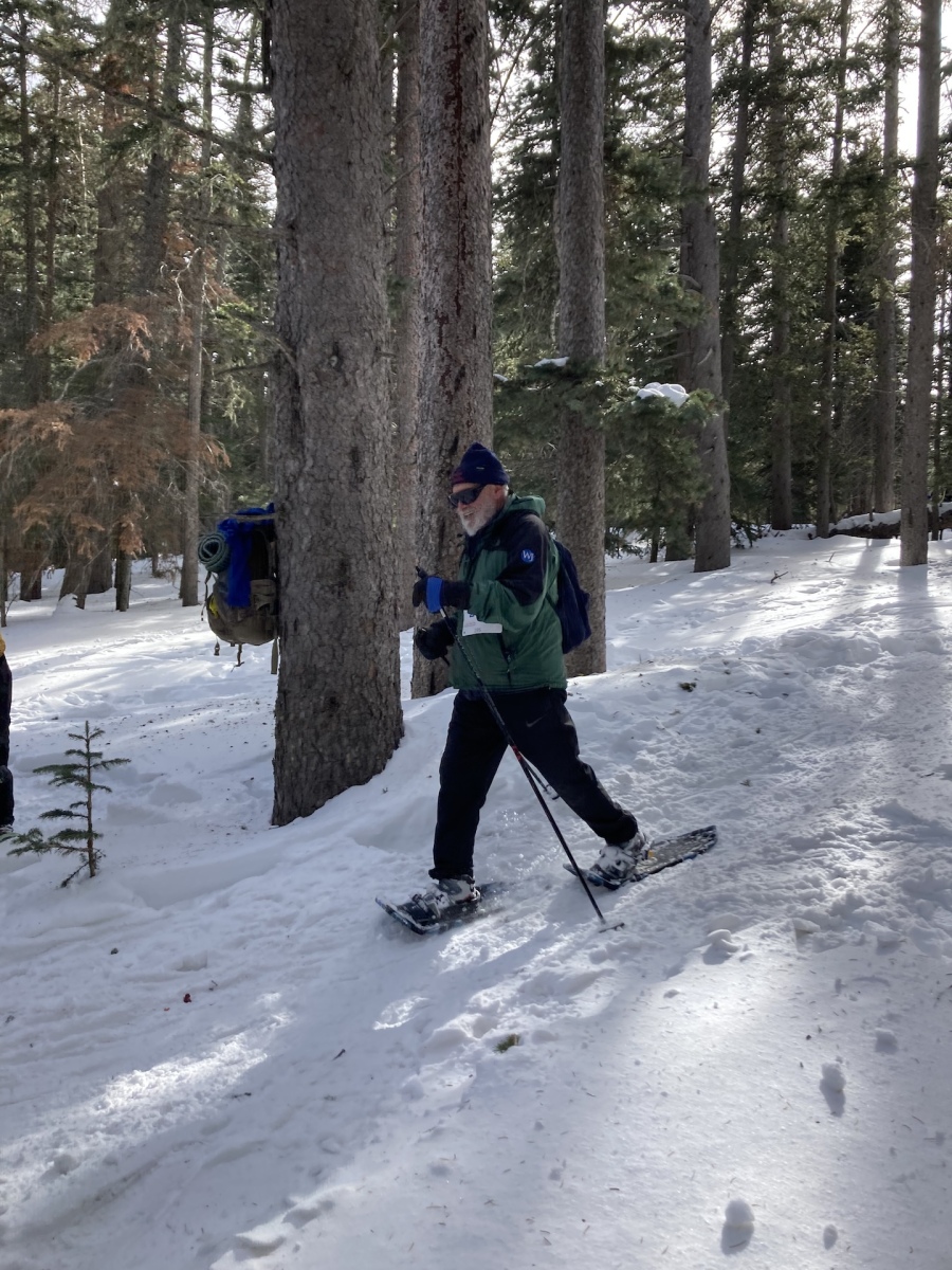 Thanks to FOSM members Silke Bletzer, Ray Iturralde, and Cliff Giles for the photos below. One shows former race director Lou Romero with a vintage pair of snowshoes that he used early in his Forest Service career. Another shows Lou with his niece who was atop Mt. Kilimanjaro the week before. One photo shows the four men who have served as race director since the inception of the Snowshoe Classic in 2001.