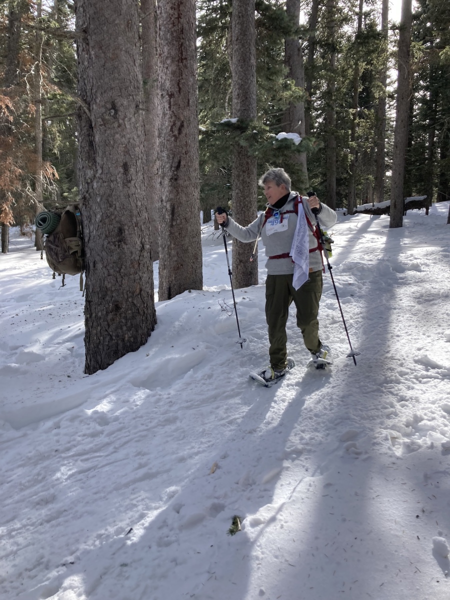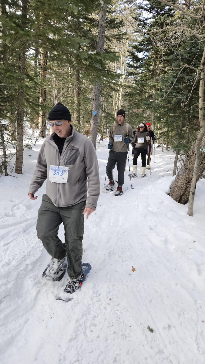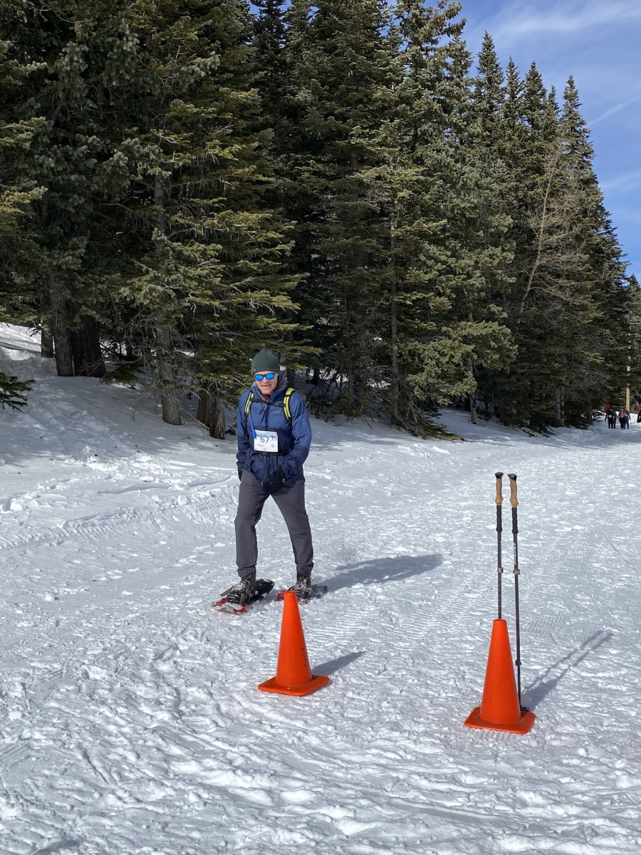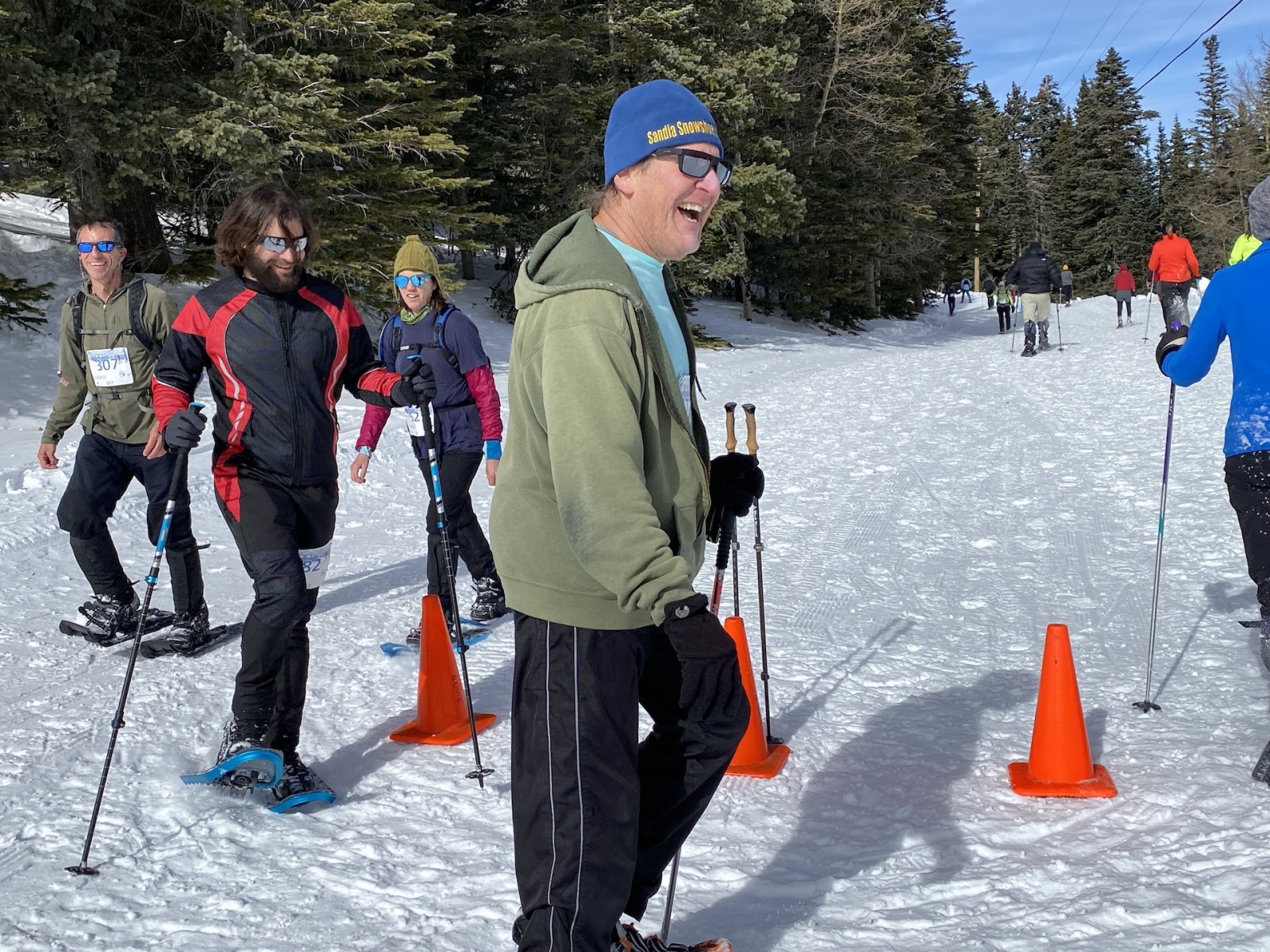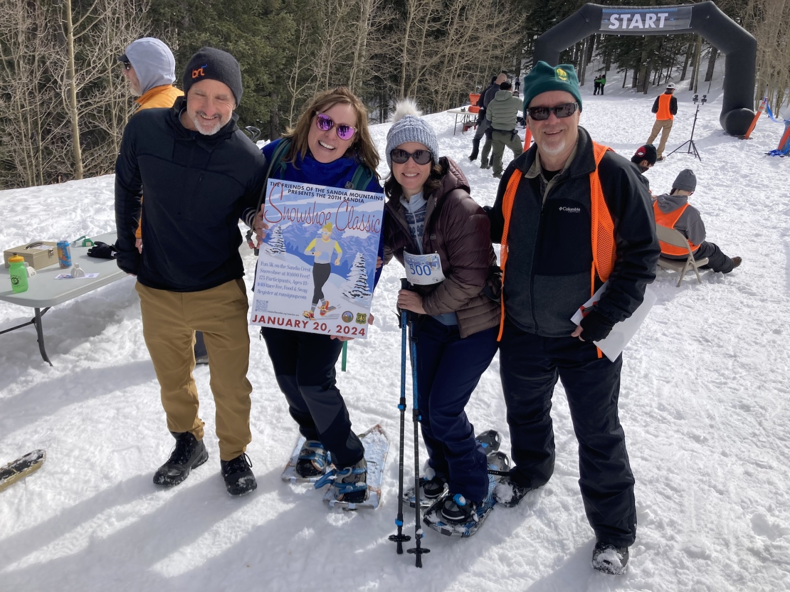 Thanks to FOSM members Silke Bletzer, Ray Iturralde, and Cliff Giles for the photos below. One shows former race director Lou Romero with a vintage pair of snowshoes that he used early in his Forest Service career. Another shows Lou with his niece who was atop Mt. Kilimanjaro the week before. One photo shows the four men who have served as race director since the inception of the Snowshoe Classic in 2001.