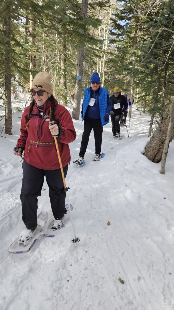 Thanks to FOSM members Silke Bletzer, Ray Iturralde, and Cliff Giles for the photos below. One shows former race director Lou Romero with a vintage pair of snowshoes that he used early in his Forest Service career. Another shows Lou with his niece who was atop Mt. Kilimanjaro the week before. One photo shows the four men who have served as race director since the inception of the Snowshoe Classic in 2001.